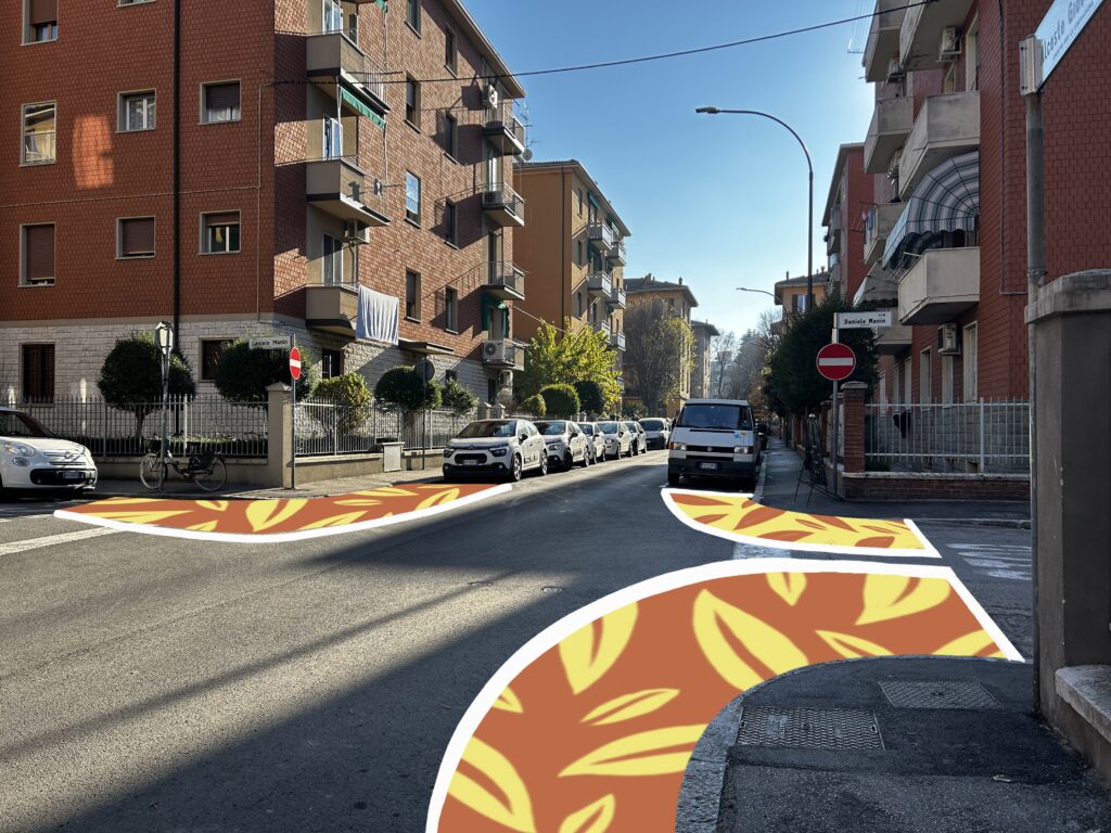 • realizzare una serie di penisole pedonali disegnate, cioè degli allargamenti dell’area pedonale in corrispondenza degli incroci, per aumentare lo spazio dedicato alle persone in strada e la loro visibilità e per far rallentare le auto;