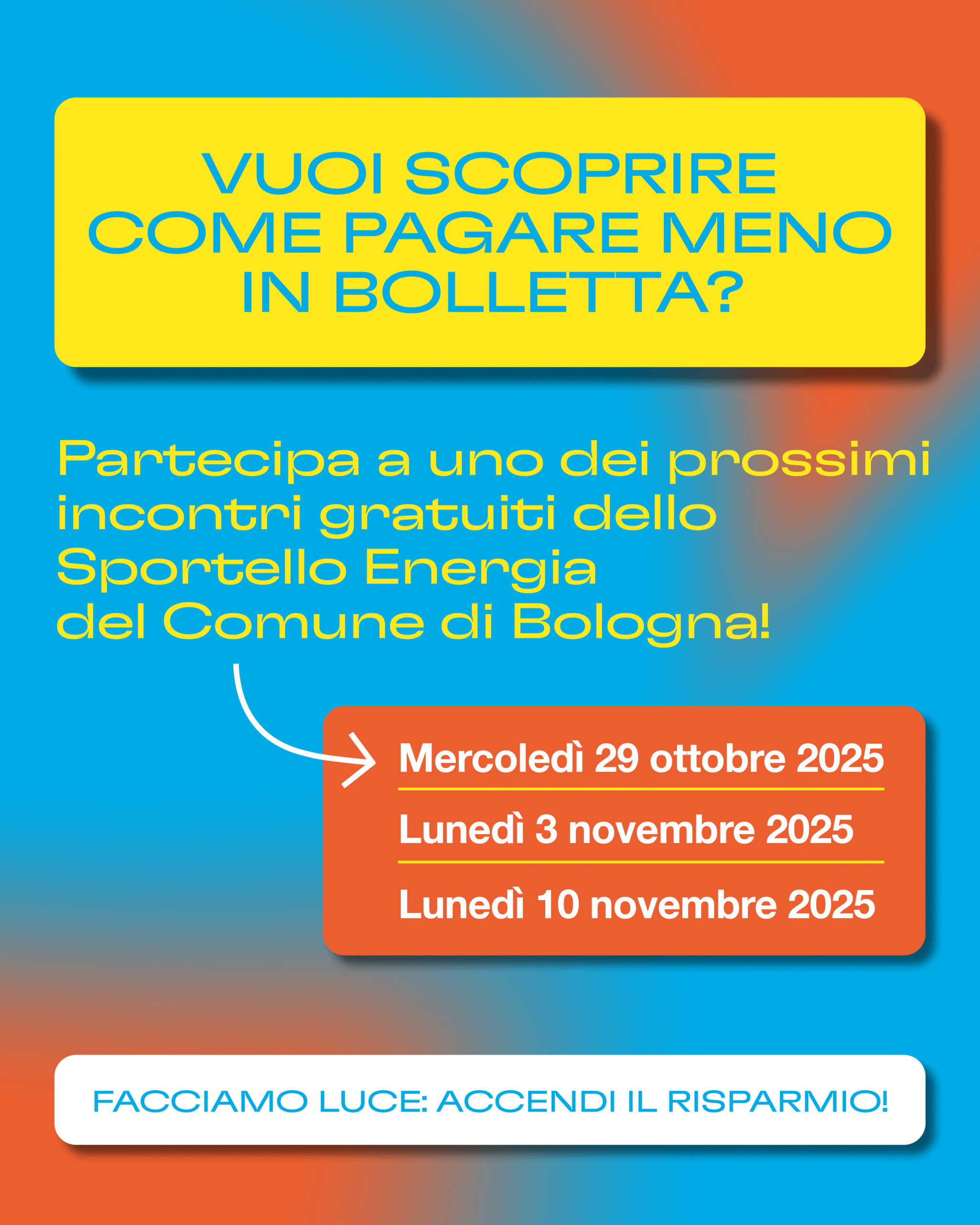 A partire dal 29 ottobre 2025, prende il via un nuovo ciclo di tre appuntamenti con lo Sportello Energia del Comune di Bologna dedicati al risparmio energetico domestico.